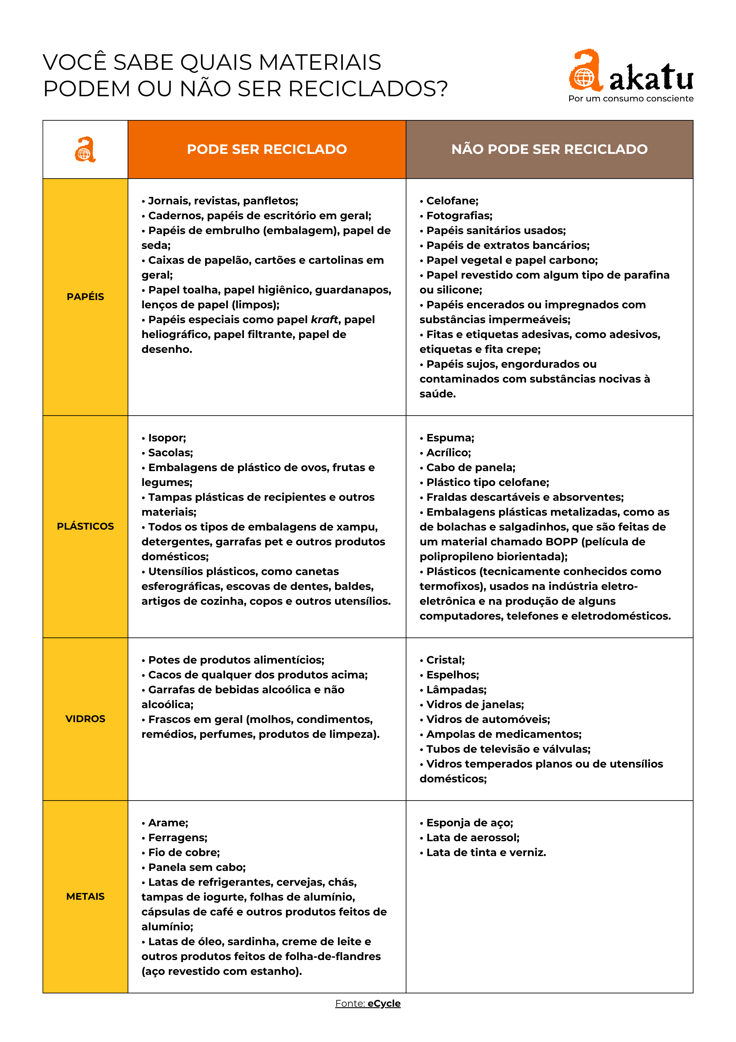 E para conhecer os materiais que podem ou não ser reciclados, consulte a tabela que elaboramos com base no site eCycle: Fonte: eCycle