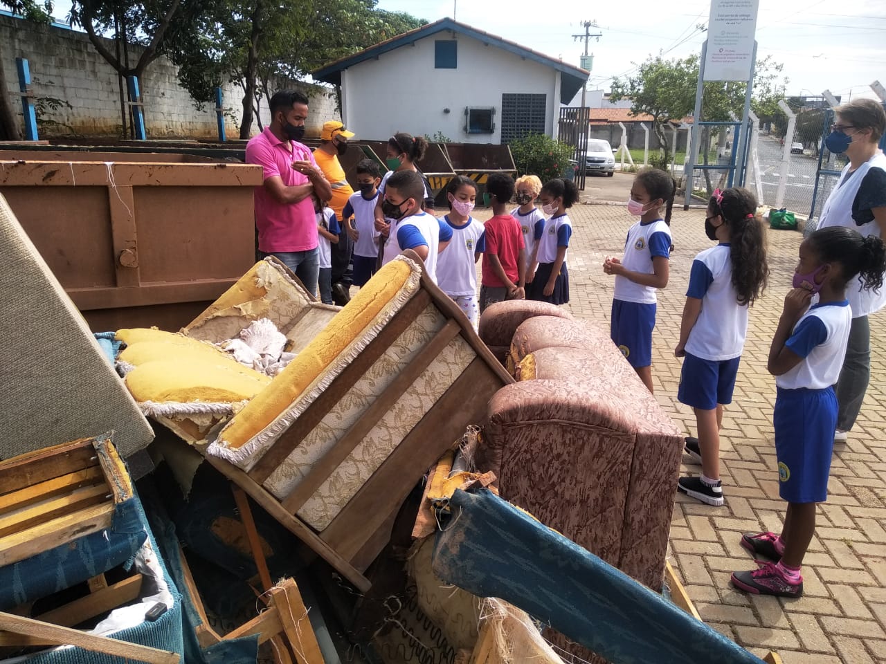 Além disso, a professora do 3° ano também comenta que foi por meio do Edukatu que ela teve conhecimento sobre um PEV (Pontos de Entrega de Pequenos Volumes) próximo a escola. Ela levou os estudantes para uma visita com as crianças, mostrando todo o local, inclusive, as estruturas internas e também com informações sobre como se solicita o agendamento para a retirada de entulhos, podas de árvores ou materiais pesados. Confira na imagem abaixo: