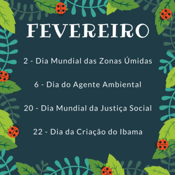 02/02: Dia Mundial das Zonas Úmidas (www.edukatu.org.br/eventos/15) 06/02: Dia do Agente de Defesa Ambiental (www.edukatu.org.br/eventos/16) 20/02: Dia Mundial da Justiça Social (www.edukatu.org.br/eventos/241) 22/02: Dia da Criação do Ibama (www.edukatu.org.br/eventos/17)