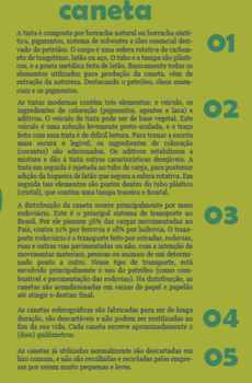 Ciclo de vida da borracha: http://www.biomania.com.br/bio/conteudo.asp?cod=2689 Ciclo de vida da caneta: https://www.behance.net/gallery/Inforgrafico-Ciclo-de-vida-do-grafite-x-caneta/9354551 Ciclo de vida do lápis: http://www.faber-castell.com.br/53901/Curiosidades/Ciclo-do-EcoLpis/fcv2_index.aspx