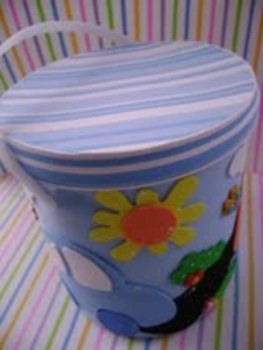 2) Agora, vamos enfeitar o balde? Vale colagem, pintura, etiquetar, grafite... Fica a critério de vocês como personalizar o seu projeto.